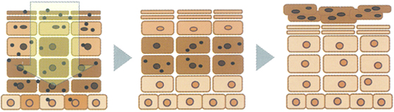 アキュティップは、メラニン(しみの原因)の吸収が高い短めの波長(500〜635ナノメートル)を使用しています。 光に反応したメラニンはターンオーバーによって表皮から出て行きます。